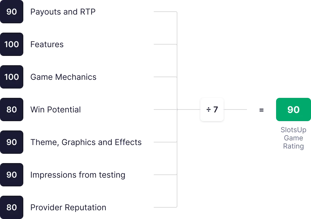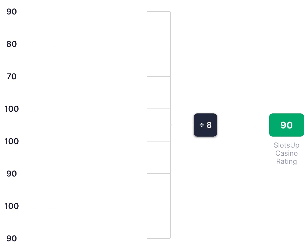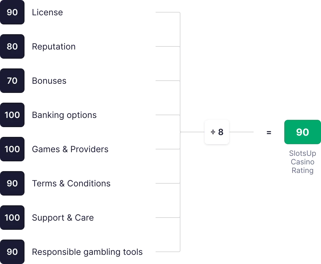 TScorul Cazinoului după SlotsUp este calculat pe baza a 8 indicatori cheie, fiecare având un punctaj de la 0 la 100. Aceste puncte sunt însumate, se calculează media, și sunt folosite pentru a stabili scorul general final.