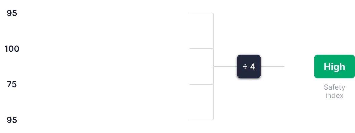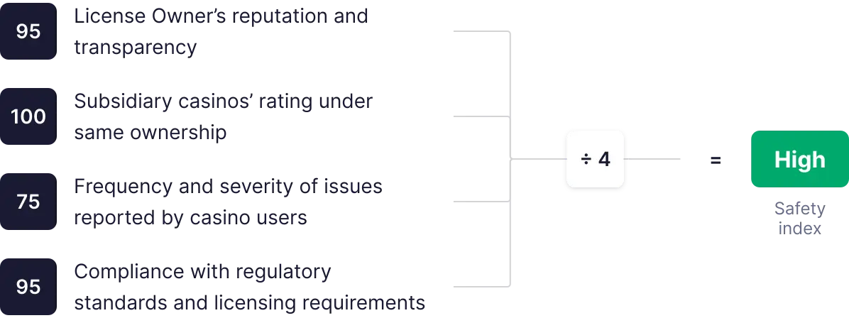 Evaluăm securitatea cazinoului pe baza a 4 criterii (2 individuale și 2 interconectate), fiecare cu un punctaj de la 0 la 100. Punctajele sunt apoi însumate, calculăm media și le folosim pentru a determina nivelul final de siguranță.