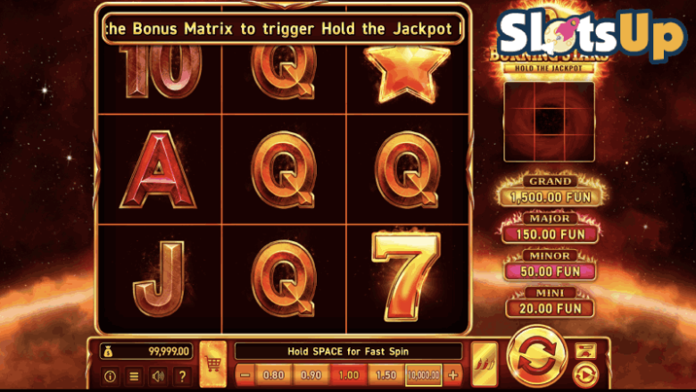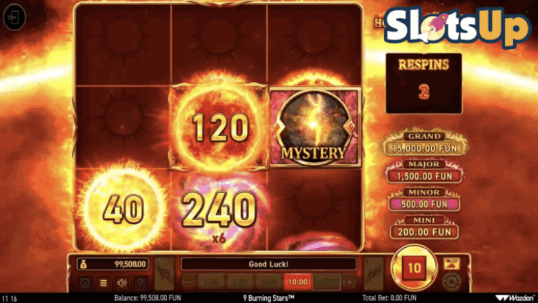 Pe măsură ce joci 9 Burning Stars, vei vedea că pe role apar simboluri suplimentare. Acestea sunt sori în flăcări cu numere pe ei. Acestea sunt apoi salvate pe Matricea Bonus, care se află în partea dreaptă sus a ecranului de joc. Odată ce aceasta este umplută, se activează runda bonus Hold the Jackpot.Toate simbolurile solare salvate se acumulează într-o singură valoare și apar pe rola centrală în timpul rundei. Apoi primiți 3 repetări, iar dacă mai apar și alți sori, aceștia se fixează și resetează contorul de repetări la 3. Simbolurile jackpot Mini, Minor și Major pot apărea și ele și fac același lucru. Acestea îți acordă, de asemenea, jackpot-ul corespunzător.De asemenea, simbolul Mystery se poate transforma în orice alt simbol bonus în timpul acestei runde. Simbolul Jackpot Mystery se transformă în unul dintre cele trei simboluri jackpot.Această rundă se încheie odată ce toate pozițiile sunt ocupate sau contorul de repins ajunge la zero. Acoperirea tuturor celor 9 poziții cu simboluri bonus vă oferă Marele Jackpot de 1.500x pariul dvs.