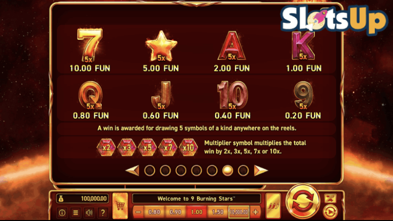 Wazdan nu a inclus nimic extrem de tematic în 9 Burning Stars în ceea ce privește simbolurile. Simbolurile cărților de joc care încep de la 9 și ajung până la A reprezintă primele adăugiri. Acestora li se alătură o stea și un număr 7, acesta din urmă oferind cele mai mari câștiguri standard din joc.