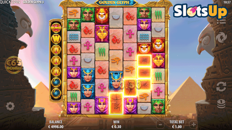 Pe lângă elementele audiovizuale ale acestui joc, ne vom concentra și asupra modului în care funcționează. Jocul de păcănele Golden Glyph 3 te ghidează printre piramide pe 7 role cu până la 9 rânduri. Așadar, grila poate avea până la 63 de poziții într-o singură tură.