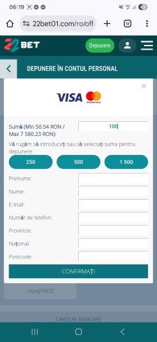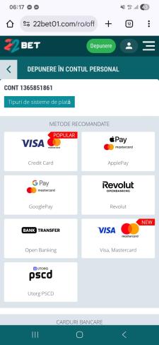Plata cu card bancar VISA sau Mastercard: limitele de depunere cu cardul variază pentru fiecare cazino și uneori pot fi de 20 până la 50 lei, dar există și situații când poți depune doar 1 leu cu un card VISA sau Mastercard, fără alte taxe.